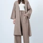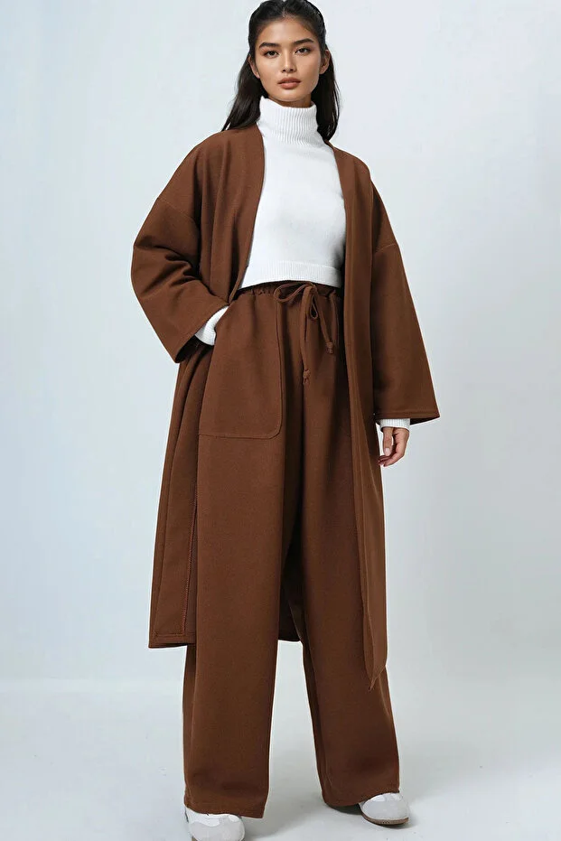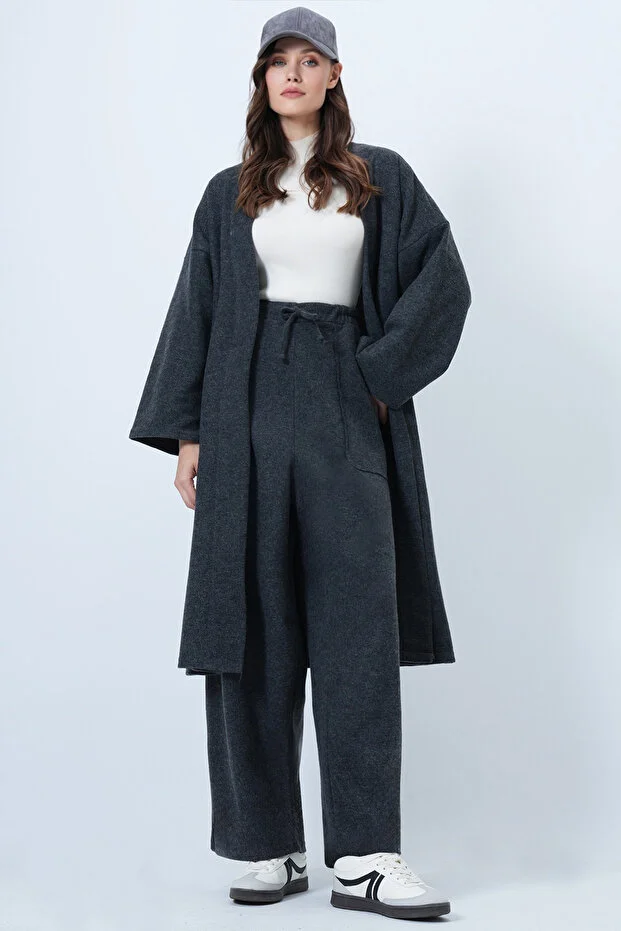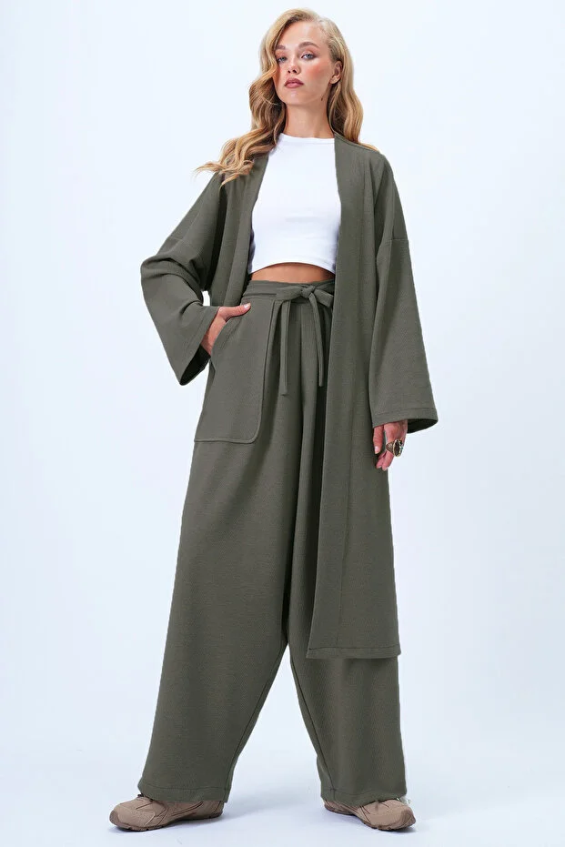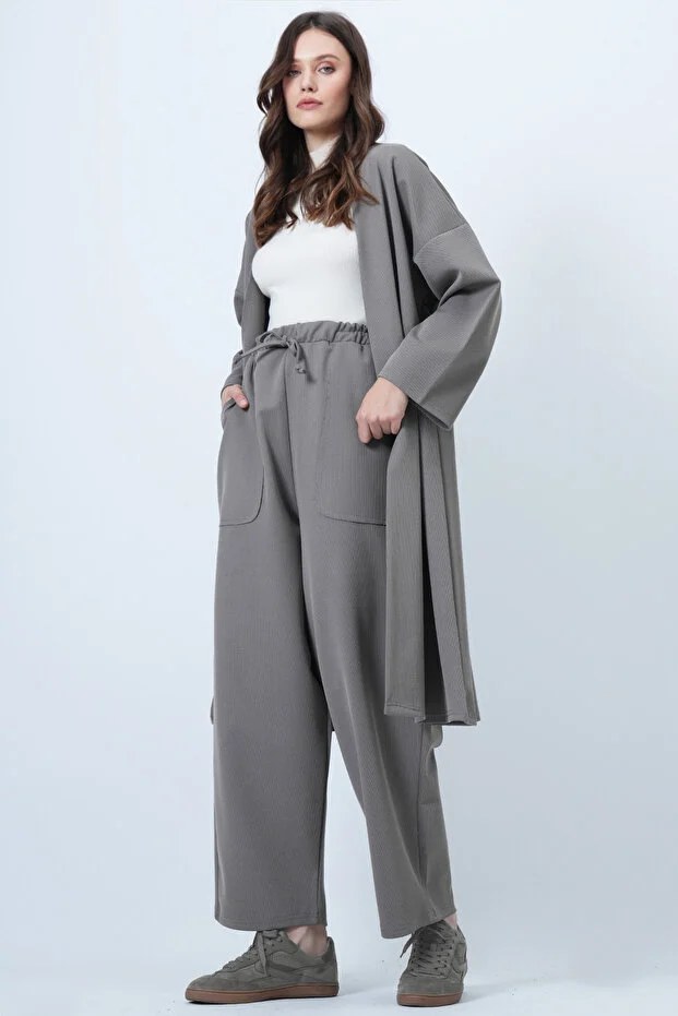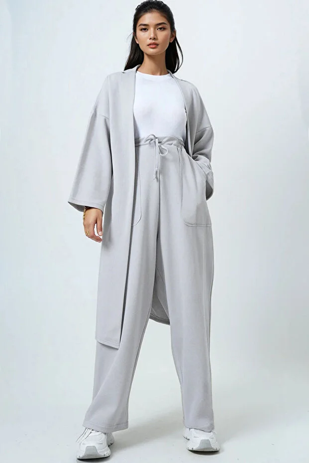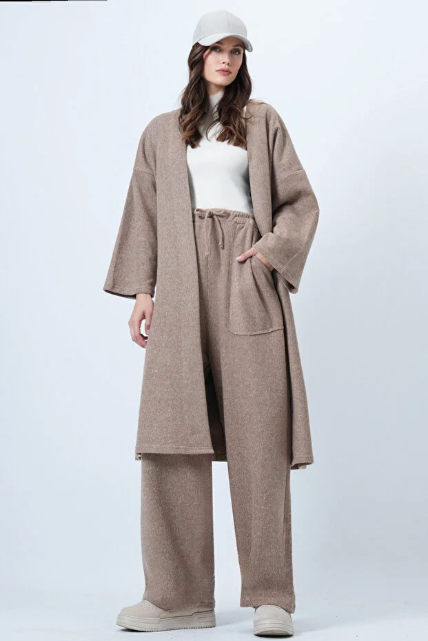 این ست با ترکیب ظرافت ساده و پیچیدگی بافتدار، با فرم کیمونوی بلند خود، ظاهری سیال ارائه میدهد، در حالی که شلوار پالازو دو جیب، راحتی و مدرنیته را با هم ترکیب میکند. بافت خود پارچه به طرح عمق میبخشد، در حالی که سبکی آن راحتی تمام روز را تضمین میکند. این ست با ماهیت تطبیقپذیر خود که امکان لایهبندی را فراهم میکند، هم با سبک شهری و هم با حال و هوای تعطیلات سازگار است و آن را برای کسانی که به دنبال ظاهری ساده اما چشمگیر هستند، ایدهآل میکند. این ست، به ویژه هنگامی که با رنگهای طبیعی ست میشود، جذابیتی جاودانه به نمایش میگذارد.